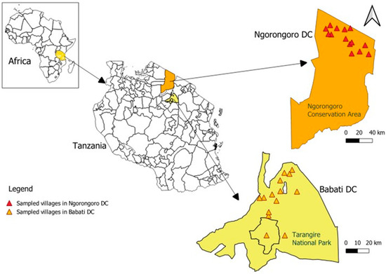 This study was conducted between September 2020 and May 2021 in Babati and Ngorongoro Districts in Northern Tanzania. Babati and Ngorongoro Districts were selected because they have a large number of pastoralists and agro-pastoralists who keep small ruminants and other livestock and have reported many cases of coenurosis [22]. Babati District is located in Manyara region at latitude 4°13′0.01″ S and longitude 35°45′0.00″ E. Administratively, the district is divided into 4 divisions, 25 wards, and 102 villages; the population size is 312,392 and about 60,000 households are engaged in keeping livestock [23]. The altitude ranges from 950 m to 2450 m above mean sea level. The present study was conducted in (all) 14 villages, which are largely involved in sheep and goat keeping in Babati District (Figure 1). Ngorongoro District is located in the Arusha region and its features have previously been described [21]. It has a population of 174,278 people and about 27,337 households are engaged in livestock keeping [23]. Fifteen villages from fourteen wards of the Ngorongoro district were randomly selected to represent low, middle, and highland ecological zones in the study (Figure 1. The low, middle, and highland ecological zones contained 12, 17, and 9 villages, respectively, and five villages were randomly selected from each zone.