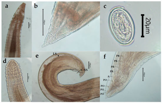 The total length and weight of eels ranged from 20.0 to 64.5 cm (mean = 29.53 ± 5.20 cm) and 14.0 to 528.0 g (mean = 54.62 ± 57.74 g), respectively. The infected eels (n = 77) with the presence of S. inermis (Figure 1a–f) were slightly larger (mean length 29.98 ± 4.92 cm) than the uninfected ones (n = 85; mean length = 29.12 ± 5.44 cm). In males of S. inermis (n = 10), the total body length averaged 9926 μm (13,899–6233 μm), the large spicule length 1018 μm (1089–951 μm), and the small spicule length from 152 μm (164–145 μm). The mature eggs on the uterus of females have the characteristic thin gelatinous polar caps.