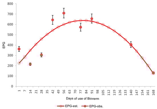 Behavior of the EPG variable in relation to the start days of biological control with Bioverme® containing the nematophagous fungus D. flagrans.