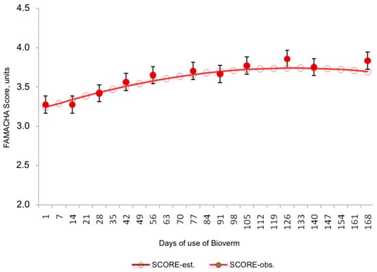 General mixed linear models were used to analyze the EPG, FAMACHA, and WEIGHT variables, incorporating the random effect of the animal simultaneously with the fixed effects of breed and days of initiating biological control (included as covariate). We do not report the coefficient of determination (R²) because, in methodologies based on mixed models, the emphasis is placed on the significance of the regression coefficients (individually and jointly) associated with the model adjusted with fixed and random effects. The quality of the model adjustment is assessed using the Akaike Information Criterion [24] and complemented by the graphical evaluation of the observed means (with error bars representing the standard errors of the mean) and the function adjusted by the mixed model. The adjusted model had a fixed breed and monitoring day included as a covariate, in addition to random components of animal and error. The animal effect was included as a random effect to account for repeated measures on the same experimental units over monitoring periods. The covariance between measurements of the same animals was considered, allowing the evaluation of different covariance structures using the AIC criteria [24]. Statistical significance was set at p < 0.05. All analyses were conducted using the SAS Program, version 9.2 (SAS Institute Inc., Cary, NC, USA).