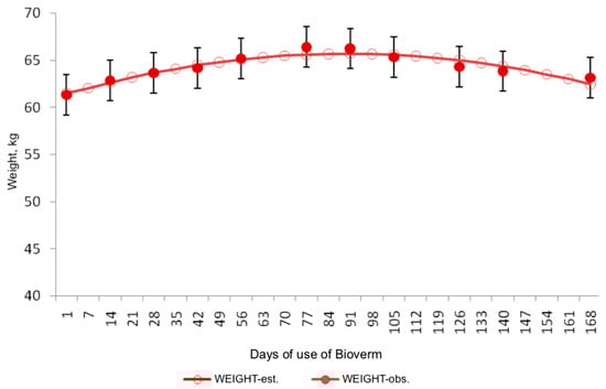 Behavior of the WEIGHT variable in relation to the days of initiation of biological control with Bioverme® containing the nematophagous fungus D. flagrans.