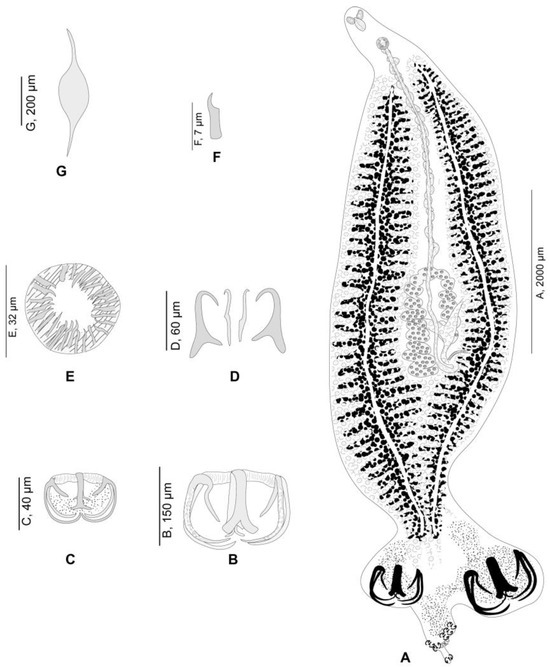 Fish were dissected fresh on the day of purchase, and the gills were investigated for parasites under a stereomicroscope. The gills were removed, placed in individual Petri dishes, and examined. Newly collected Polyopisthocotyla were heat-killed, fixed in near-boiling saline, and preserved immediately in 70% ethanol. Polyopisthocotylans were stained with acetic carmine, dehydrated in a graded series of alcohol for 15 min each (70, 96, and 100%), cleared in clove oil, and mounted in Canada balsam [14]. Polyopisthocotylans were identified on stained whole mounts. Drawings were made through a Nikon Eclipse i80 microscope (Nikon Eclipse Ni, Nikon, Tokyo, Japan) with DIC (differential interference contrast) and a drawing tube. Drawings were scanned and redrawn on a computer with Adobe Illustrator 2023 (Adobe Inc., San Jose, CA, USA). Measurements of whole mounts are in micrometers and indicated as the range followed by the mean in parentheses.