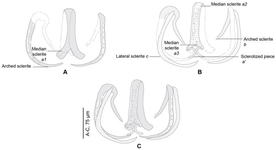 Anterior discocotylid-type clamps consisting of two jaws: anterior (Figure 2A) and posterior jaw (Figure 2B). Anterior jaw with an inverted U-shaped sclerotized median sclerite a1; a1 giving rise to an expansion in each jaw. In anterior jaw, a1 ending distally in T shape with relatively short branches. Proximally, a1 folding and giving rise to a2; a2 passing into posterior jaw. Margins of anterior jaw supported by two arched sclerites b. Distally, b ending parallel to a’. Proximally, each arched sclerites b folding back to widen the posterior jaw. Posterior jaw marked at its center by a median sclerite a2, which continues to a3. Distal end of a3 forming an inverted V with long branches. This end is hollowed out by a V-shaped notch with pointed edges. Below a3, two small crescent-shaped sclerotized a’ pieces are articulated (Figure 2C). Margins of posterior jaw supported by two arched lateral sclerites c. On proximal side, a muscle connecting a2 to b.