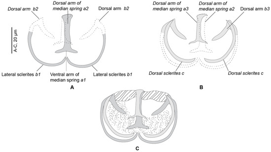 Small microcotylid-type clamps, consisting of two jaws: anterior (Figure 3A) and posterior jaw (Figure 3B). Ventral arm of median spring a1 T-shaped, long, distal part of a1 with short branches of equal size. Dorsal arm of median spring a2 slightly shorter than its ventral arm, a1, T-shaped, distally broad. Ventral arm of ventral jaw consisting of two lateral sclerites b1; dorsal arm b2, shorter and curved inwards; b3 not reaching dorsal arm of median spring. Dorsal jaw sclerites c not reaching midline on distal side. Muscles connecting a and b2 present on proximal side (Figure 3C).