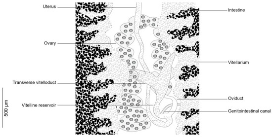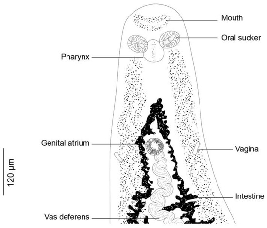 - Dawes, B. The Trematoda with Special Reference to British and Other European Forms; Cambridge Univ. Press: Cambridge, UK, 1946; pp. 1–644. [Google Scholar]