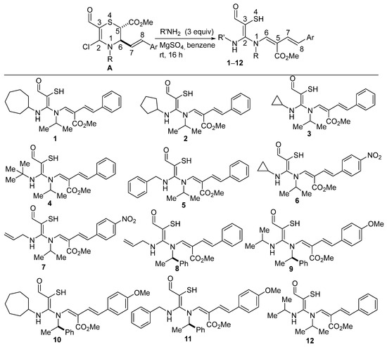 Due to the low intrinsic acidity of amines, transition metal-catalyzed C–N bond-forming transformations typically necessitate the use of strong inorganic bases and costly ligands. The situation is exacerbated when inherently inert and sterically challenged vinyl chlorides are employed as coupling partners. An ideal atom-economical and practical approach is one that obviates the need for transitional metals, ligands, and bases. Desiring a transition metal-free as well as a base-free amination approach to fully functionalized enethiols bearing amine functionalities, we reasoned that deconstructive functionalization of in-house substrates such as A offered an excellent starting point. Ultimately, the enethiols employed in these studies were prepared by amination of chloroenals of type A with several primary amines using the water-free conditions described in Figure 1. The cascade reaction that converts A to the desired enethiols (1–12) involves (a) nucleophilic displacement of the chloride by the amine, (b) amine-assisted ring-opening, and (c) 1,2-migration of the styrenyl group. The last two steps have been previously documented in a related system [18].