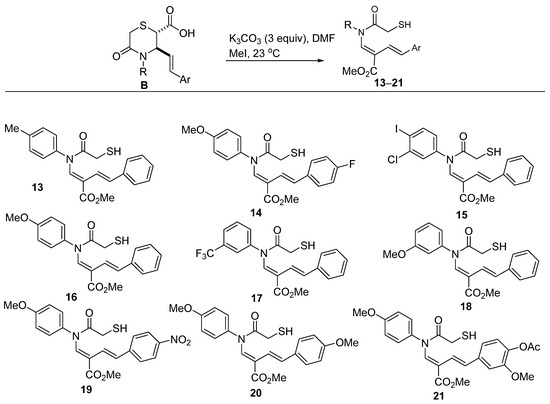 General Procedure B (Synthesis of amidothiols 13–21): To a stirring suspension of acid B (1 mmol), dissolved in DMF (2 mL), and K2CO3 (3 equiv) was added methyl iodide (2 equiv) under nitrogen atmosphere. The reaction mixture was stirred for 12–22 h (TLC monitoring). After complete conversion, it was diluted with water and extracted with EtOAc (2 × 20 mL). The combined organic extracts were washed with brine, dried over MgSO4, and concentrated in vacuo to give the desired methyl ester, which was purified by flash chromatography on silica. All compounds and their characterization data have previously been reported by us [16].