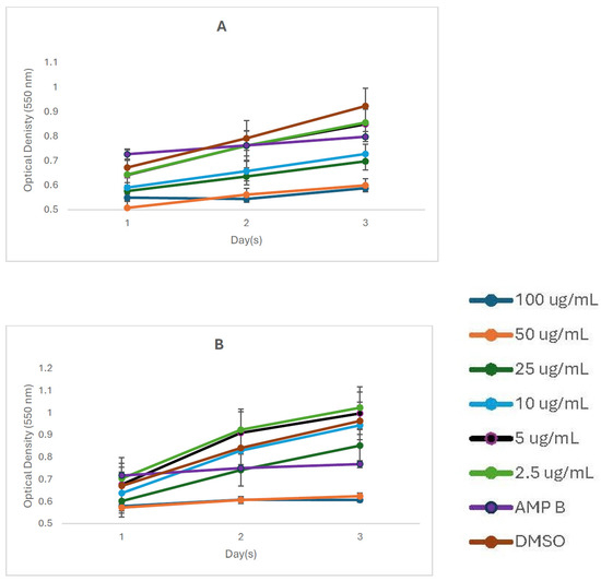 The parasites were cultured and harvested seven days after incubation. They were added to 96-well plates at a final concentration of 106 promastigotes per well in a complete Schneider’s Insect medium. Organic compounds were initially dissolved in dimethyl sulfoxide (DMSO) and tested at 100 μg/mL for a final concentration of DMSO in each well at 1%. Our negative control contained 1% DMSO, the final concentration of solvent in which test compounds were evaluated. Amphotericin B, a compound currently approved for the treatment of human leishmaniasis, was used as our positive control. Test compounds and positive control were assayed in triplicate at 100 μg/mL and added to each well at day 0 post-incubation. The activity of the compound was estimated using a colorimetric assay with the addition of Alamar Blue (Thermo Fisher Scientific, Waltham, MA, USA) to each well, as previously described [21]. Alamar Blue contains resazurin (blue) that is reduced by metabolically active parasites to resorufin (red). Plates were incubated at 26 °C. After 48 h of incubation, the optical density was recorded at 550 nm using a Quant plate reader (Biotech Industries, Winooski, VT, USA). The optical densities of the triplicate were averaged, and statistical tests were performed to assess any statistical differences with Amphotericin B, the positive control. For multiple-group comparisons of data, one-way and two-way analyses of variance were performed, followed by the Tukey–Kramer multiple comparison test.