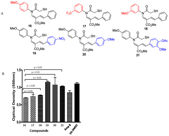 Chemical structures of compounds 16 to 21 are presented (A). Optical densities of test wells of compounds 16 to 21, positive control (Amp B or Amphotericin B), and negative control (1% DMSO) corresponding to anti-Leishmania activity were recorded (B). All values are means ± standard errors (SE). p-values for differences between compounds of “similar” chemical structure that reached statistical significance (<0.05) are shown above horizontal bars.