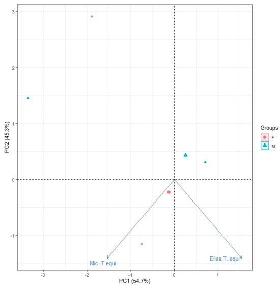 The Principal Component Analysis (PCA) highlights the relationship between Theileria equi infections in male and female horses and two diagnostic methods, microscopy and ELISA. The 96.0% of the total variation determining this relationship indicates a strong relationship between the presence of T. equi in the two genders of horses. However, the positive relationship between the ELISA method and T. equi in male horses suggested that the ELISA method is more reliable than the microscopic method in detecting T. equi, especially in male horses, perhaps due to lower parasitemia or differences in immune response between the two genders [17].