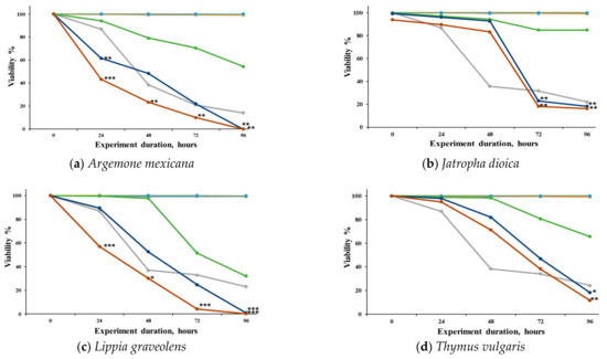 We adapted to the characteristics of our experimental model of S. venezuelensis and to our objective, which was to characterize plant extracts in terms of efficacy against the infective phase and toxicity to mammalian cells and to be able to propose new studies. We did not perform studies on L1 or L2 because the intention was to look for active principles on the host, and L1 and L2 are found in the soil. Also, we can cultivate the L3 phase for a week, conserving motility up to 85% for a week. In our experiments, we conserved the untreated controls for a week, but our results were recorded at 24, 48, 72 and 96 h following the general use to report information in three days after the treatment.
