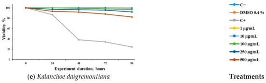 We observed the concentration–response effects of the different extracts evaluated against S. venezuelensis (Figure 1). It can be observed that the extracts of A. mexicana (Figure 1a) and L. graveolens (Figure 1c) demonstrated significant activity at 250 and 500 μg/mL. J. dioica (Figure 1b) showed significant activity at 72 h post-treatment at 250 and 500 μg/mL, while T. vulgaris (Figure 1d) showed activity up to 96 h at the same concentrations. K. daigremontiana (Figure 1e) did not demonstrate any significant effect against the L3 larvae at any of the evaluated concentrations.