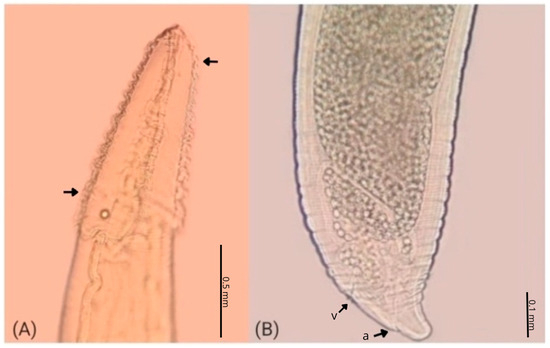 Syncuaria squamata, female. Host: Nannopterum brasilianum. (A): Anterior portion with arrows demonstrating cephalic cordons. (B): Posterior portion with arrows demonstrating its vulva (v) and anus (a).