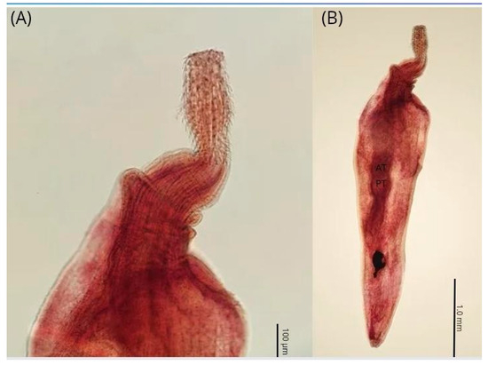 Anterior portion (A) and body (B), demonstrating anterior testicle (AT) and posterior testicle (PT) of Andracantha tandemtesticulata. Host: Nannopterum brasilianum.