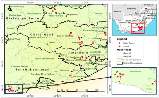 Map of the Eastern Cape Province of South Africa showing the districts (Nelson Mandela Bay Metropolitan, Amathole, Buffalo City Metropolitan, Chris Hani, and Sarah Baartman), including local municipalities, and specific dairy farm sites surveyed during the study. (Letters A–O are the abbreviated names of the farms visited during the survey to keep them anonymous.)