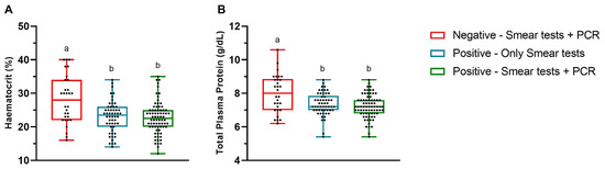 Mean hematocrit (A) and total plasma protein concentration (B) values in the Trypanosoma-positive and -negative cows based on the total blood smear, buffy coat smear, and polymerase chain reaction (PCR) tests in the state of São Paulo, Brazil. Different lowercase letters above the boxes indicate statistically significant differences. The ends of the box correspond to the upper and lower quartiles, with the median indicated by a horizontal line inside the box. The whiskers extend outward to the maximum and minimum observed values.