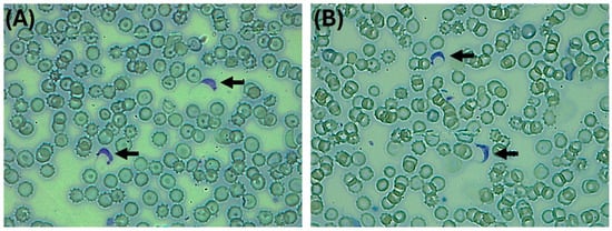Giemsa-stained mouse blood samples at 100×. (A) Presence of T. cruzi in mouse 1 and (B) presence of T. cruzi in mouse 2.