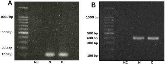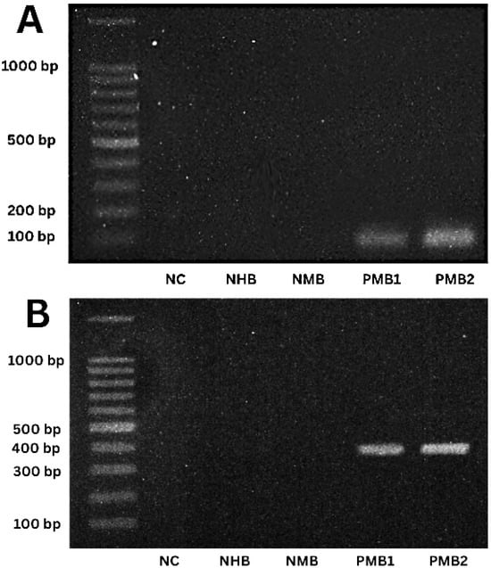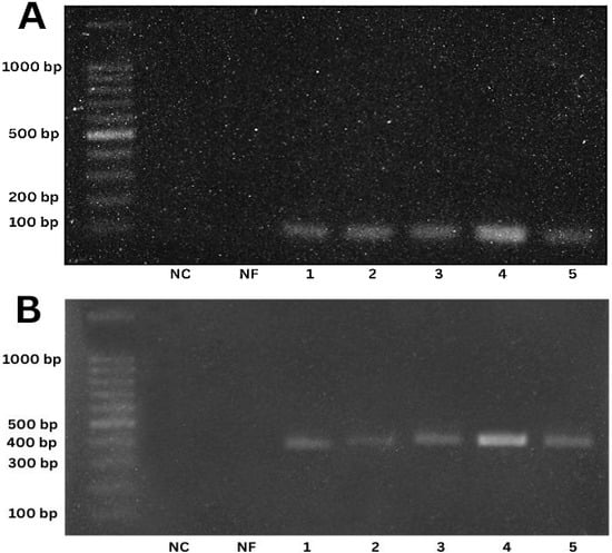 The amplified products were stored at −20 °C until analysis by electrophoresis. For evaluation, 1.5% agarose gels (Karal®, Ciudad de Mexico, Mexico) were prepared, and electrophoresis was performed at 100 V for 45 min. The gels were subsequently stained with ethidium bromide and visualized using a MiniBIS Pro® transilluminator (Bio-Imaging Systems, Haifa, Israel).