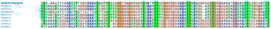 Subsequently, a multiple alignment was performed between the obtained sequence (BankIt2933897 Seq1 PV256432), the amplification product of the kinetoplast minicircle from Trypanosoma isolates collected in Calvillo, Aguascalientes, and reference kinetoplast minicircle sequences of T. cruzi from GenBank. The wild strain, designated “Problem-Sequence,” was found to be related, showing an approximate 60% identity with reference T. cruzi kinetoplast minicircle sequences. Notably, a higher identity percentage was observed with T. cruzi clones M369r (U07846.1) and M835 (U07845.1) (Figure 7, Table 2).