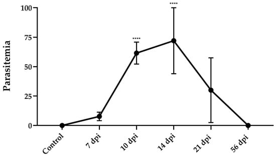 3.1. Parasitemia in Dm28c Infected Mice Showed a Peak at 14 Days Post-Infection and Became Undetectable by Day 56