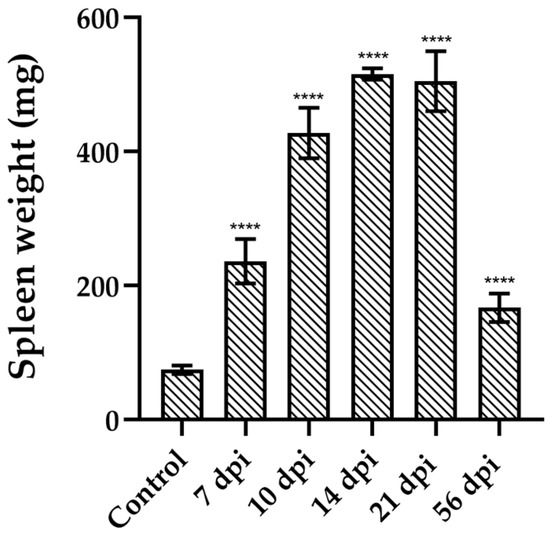 Given the spleen’s pivotal role in immune surveillance and parasite control, we evaluated its size throughout infection with the Dm28c strain. Splenomegaly was evident in infected animals as early as 7 dpi. Spleen weight progressively increased during infection, peaking at 14 dpi with a mean weight of 516.1 ± 8505 mg (mean ± SD), representing nearly a 7-fold increase compared to uninfected controls (Figure 3). Thereafter, spleen size gradually decreased, reaching values comparable to those observed at 7 dpi at 56 dpi.