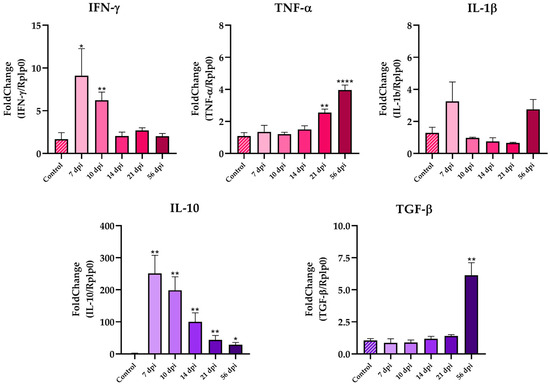 To better characterize this inflammatory response, we evaluated the mRNA levels of pro- and anti-inflammatory cytokines in the spleen by RT-qPCR. Animals showed an increased expression of IFN-γ from 7 to 10 dpi and then a decrease during the rest of the infection, as shown in Figure 4. A similar pattern was observed for IL-1β, which reached its maximum expression at 7 dpi and gradually decreased over time, although these changes were not statistically significant. TNF-α expression remained low until 21 dpi, where its levels significantly increased (** p < 0.01, Figure 4). On the other hand, IL-10 expression increased at 7 dpi and gradually declined, but IL-10 mRNA levels remained significantly elevated compared to uninfected animals (Figure 4). No changes were found in TGF-β levels during the acute phase.