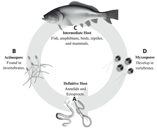 Myxozoans exhibit a complex life cycle that involves alternating between invertebrate and vertebrate hosts. The latter serve as intermediate hosts, whereas invertebrates act as definitive hosts, particularly those from the classes Oligochaeta and Polychaeta, which belong to the phylum Annelida [7]. Transmission between hosts occurs through two morphologically distinct forms: the myxospore, which develops in vertebrates, and the actinospore, which is found in invertebrates. Typically, this transmission occurs via spores that disperse in water, as shown in the work of Fiala et al. [2] and Figure 1.