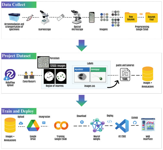 The image collection system used in this study belongs to the LIMMT. The team imaged all parasites of the genera Henneguya and Myxobolus found during necropsies between 2022 and 2024 via smartphones, as exemplified in the pipeline (Figure 2). In total, 125 images with dimensions of 2160 × 3840 pixels were collected and subdivided into 12 smaller images with dimensions of 640 pixels. Therefore, the sample comprised 12,000 images divided into two genera, Myxobolus and Henneguya, covering various species of Amazonian fish and different tissues, such as gills, liver, and skeletal muscle. The images were uniformly sized at 640 pixels each and were in JPEG format.