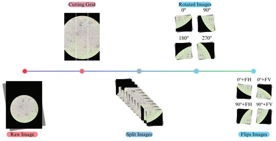 To enhance the generalizability of the model for identifying microparasites in microscopy images, several image processing techniques were employed, as shown in Figure 3. As discussed by Zhao et al. [20], rotations were applied at angles of 90°, 180°, and 270°. Additionally, horizontal and vertical flips were employed on the original images and at 90° clockwise, as demonstrated in the works of Bydder et al. [35], Zendehdel et al. [22], and Ghose et al. [36], thus avoiding redundancies. These transformations provided increased diversity in the dataset because, after subdividing the original images, each subunit resulted in eight new unique images. This helped the model recognize patterns in multiple orientations and reflections, thereby improving its robustness and accuracy in detecting these genera in various scenarios.