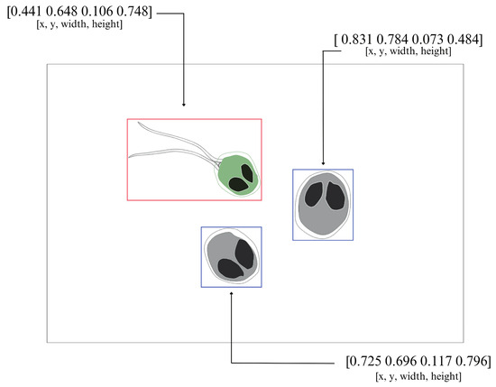 This requirement was met by carefully creating bounding boxes, precisely outlining the location of the myxozoans, and assigning each genus a specific label, as shown in Table 1. This enabled the generation of label files in the “.txt” format linked to the source image. These files included the category (in this case, the genus) and bounding box coordinate information (X: x-coordinate center of the bounding box; Y: y-coordinate center of the bounding box; W: width of the bounding box; and H: height of the bounding box), as illustrated in Table 1.