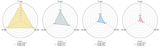 YOLOv5 (s, n, m and l), training time (TT), model size (TM), and GPU memory usage (UM), features normalized by the number of epochs.
