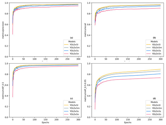 YOLOv5 models—(a) precision across epochs, (b) recall across epochs, (c) mAP@0.5 across epochs, and (d) mAP@0.5:0.95 across epochs.