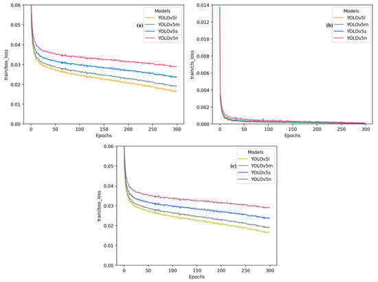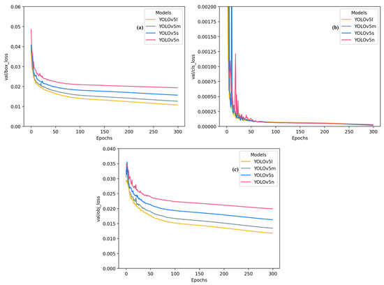 However, Figure 9a–c indicates losses during validation, which were not discrepant and followed a trend similar to that during training, with the losses rapidly decreasing in the first 50 epochs. The YOLOv5n model again presented the highest final losses, whereas the more complex models achieved better validation results.