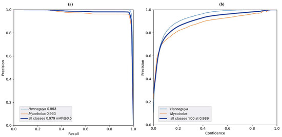 Figure 10a shows precision and recall, while Figure 10b highlights precision and confidence, the performance of the models in distinguishing the genera Henneguya, Myxobolus, and background. Overall, the YOLOv5l model achieved a robust accuracy of 99.3% for Henneguya, indicating that almost all of its predictions were correct, even with high recall. For Myxobolus, a precision of 96.6% demonstrated high performance, though slightly lower than that of Henneguya. The average precision for all classes (mAP: 0.5) of 97.9% highlights the consistency of the model. In the recall–confidence curve, even with high confidence, the model maintains recall, indicating that its predictions are reliable.