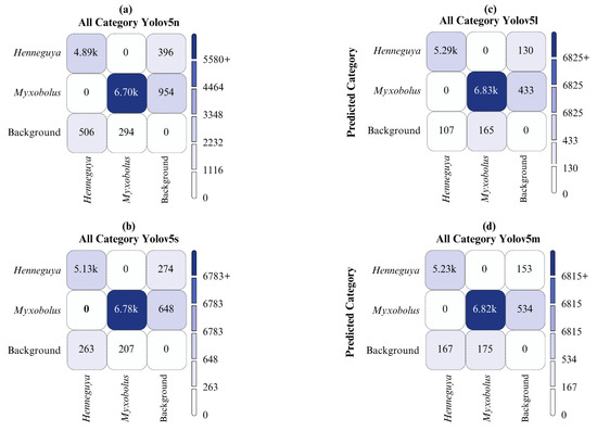 The confusion matrices shown in Figure 11a–d for the YOLOv5n, YOLOv5s, YOLOv5l, and YOLOv5m variants provide an analysis of the performance for the detection of Henneguya, Myxobolus, and background. Furthermore, YOLOv5n correctly identified 4.89k (TP) instances of Henneguya, with 396 false positives (FPs), and 6.70k TPs for Myxobolus, with 954 FPs. Although it performs well in detection, the number of FPs can still be reduced. Additionally, YOLOv5s maintained balance, identifying 5.13k TPs for Henneguya with 274 FPs and 6.78k TPs for Myxobolus with 648 FPs. A notable reduction in false positives was observed compared with YOLOv5n.