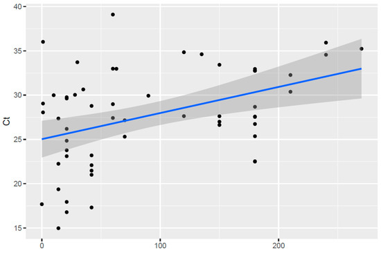 Correlation between estimated age (in number of days) and qPCR Ct values in TBF-positive lambs. Black dots represent individual data points with the linear regression line represented by the blue line.