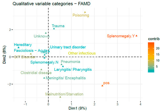 Two dimensional FAMD of disease agents and splenomegaly associated with TBF positivity. Relative contributions of categories are indicated by gradient colour. Binary variables (e.g., splenomegaly) are represented by their two modalities: presence (Y) and absence (N).