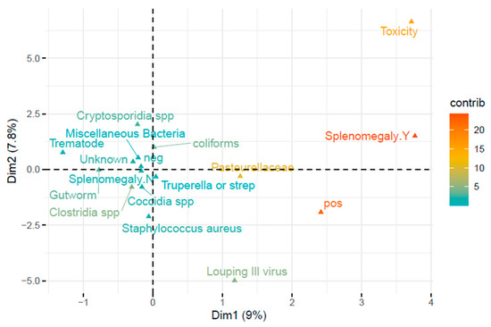 Factor Analysis of Mixed Data (FAMD) indicated a significant correlation between TBF-positivity and splenomegaly (Figure 3). Splenomegaly was noted in 37 carcases and was significantly more common in TBF-positive cases (8/57 animals; 14%) than it was in TBF-negative cases (29/807 animals; 3.6%) (X2 (1, n = 864) = 14.2, p < 0.001). Other diagnostic findings showed weaker associations with TBF-positivity in the FAMD, including malnutrition/starvation, laryngitis/pharyngitis, and pneumonia. It should be noted that dimensions one and two only explained nine and eight percent of the variances in the data, respectively.