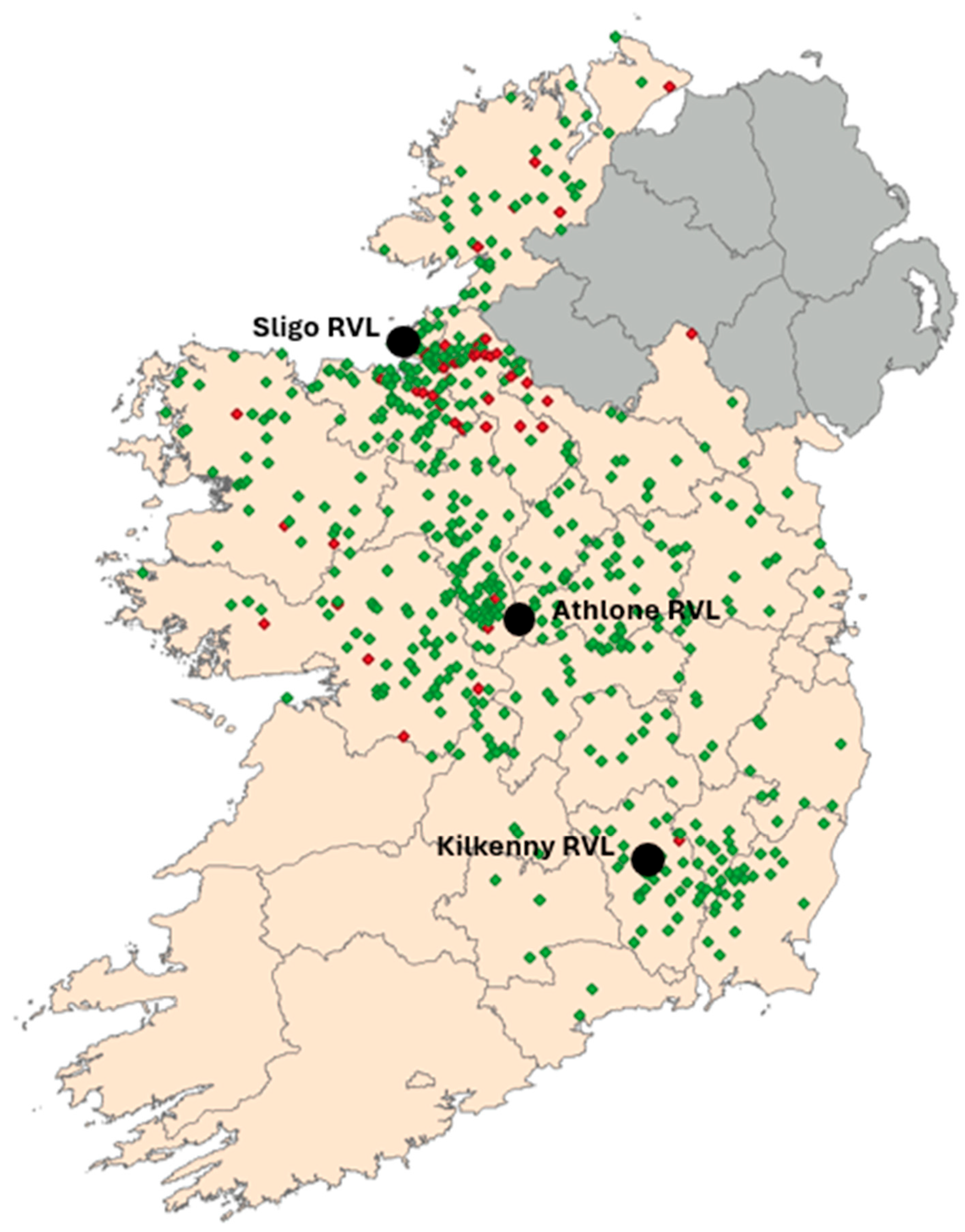 - DAFM. 2023 All-Island Animal Disease Surveillance. 2023. Available online: https://www.animalhealthsurveillance.agriculture.gov.ie/currentnews/allislanddiseasesurveillancereport2023.html (accessed on 30 July 2025).