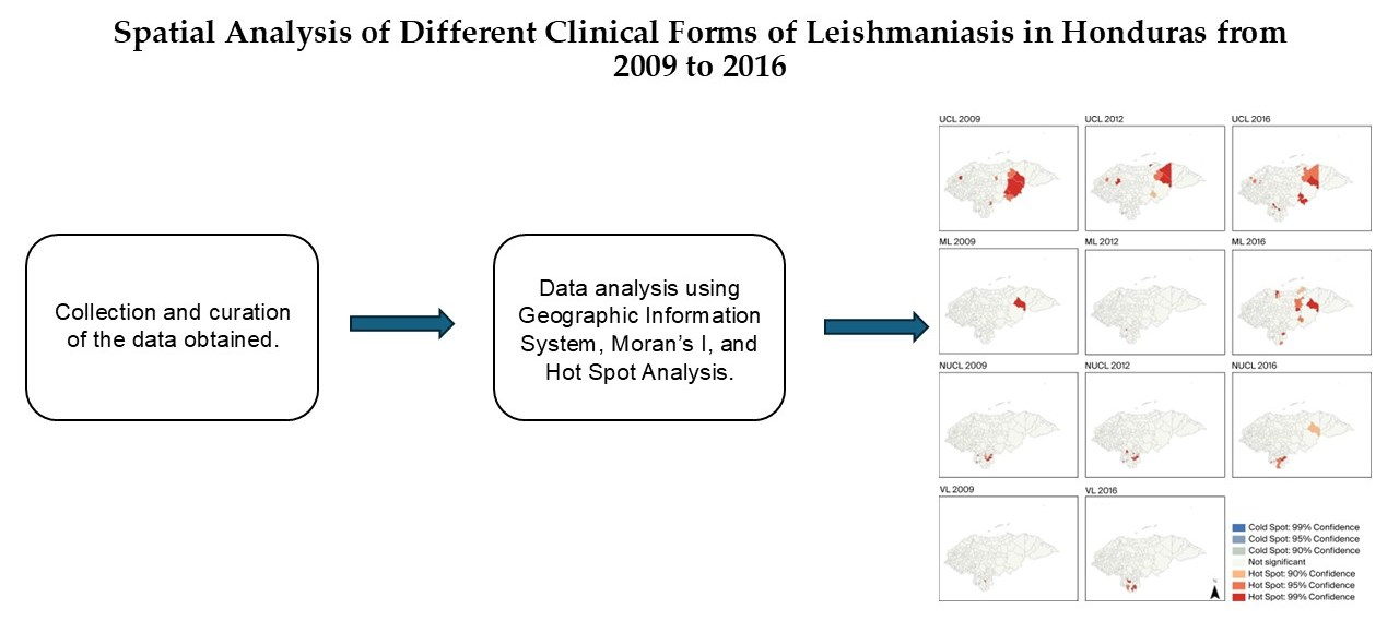 The results of the technical spatial statistics based on GIS illustrate the spatial behavior of the different forms of leishmaniasis from 2009 to 2016 in Honduras. This constitutes a baseline for future investigations regarding the biophysical factors of the terrain that can directly affect this distribution pattern, such as soil types, topography, vegetation, and regional climate, for a comprehensive analysis of the disease.