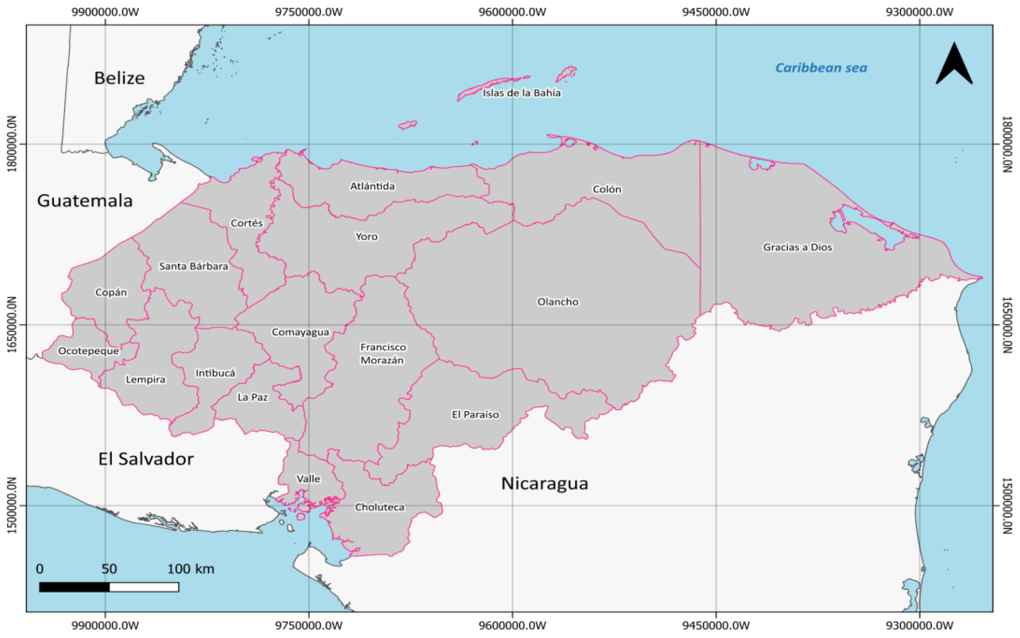 Honduras is located in northern Central America (15°11′60″ N 86°14′30.9″ W), and has a population of 9,880,507 across 111,890 km2 [14]. The climate is tropical, with an estimated average annual rainfall of 1500 mm. The yearly average maximum and minimum temperatures are 35 °C and 19 °C, respectively. Honduras is divided into 18 regional governments known as departments and 298 municipalities (Figure 1).