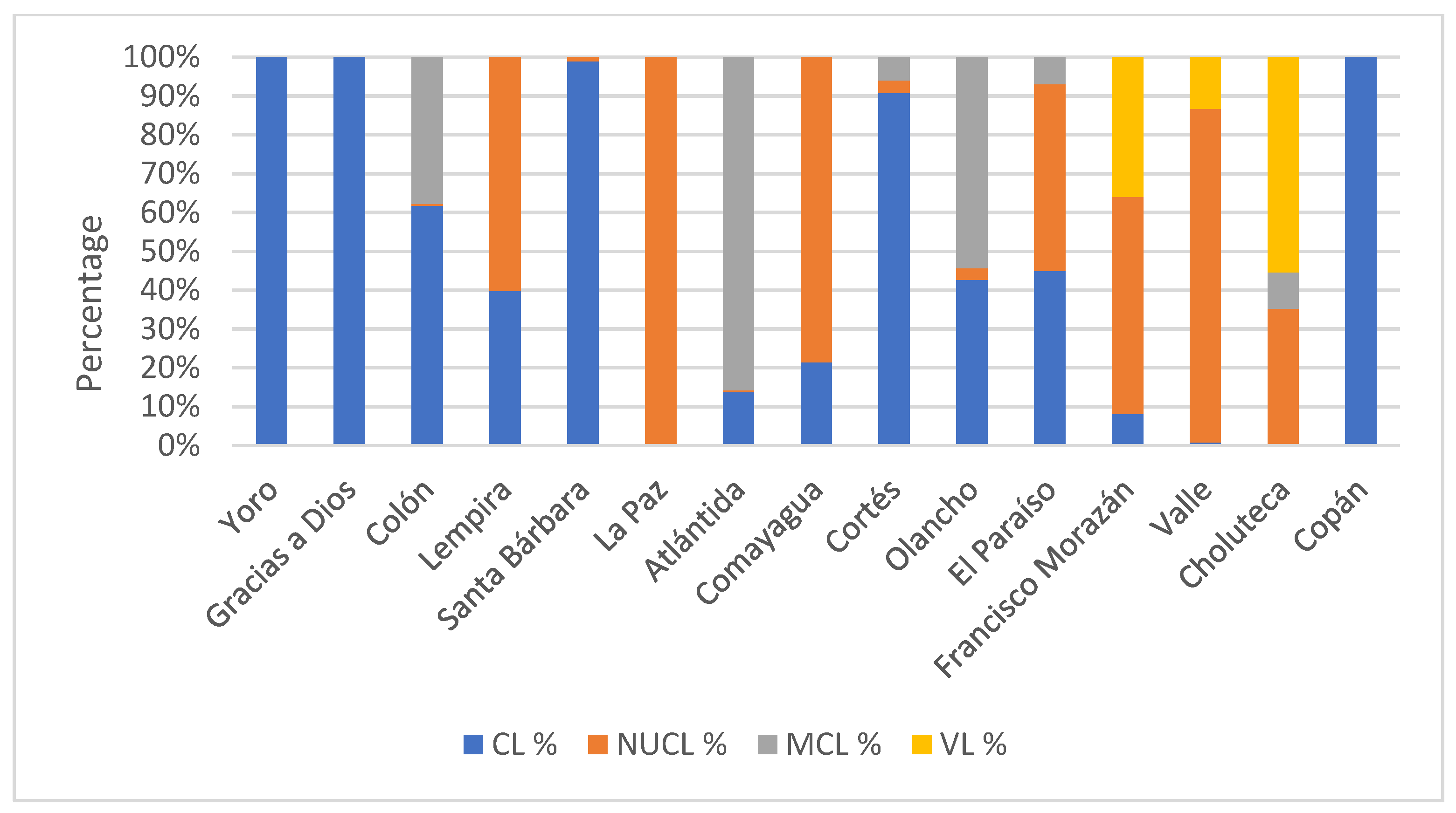 Currently, there is no reference regarding the distribution of Leishmania species in Honduras. Specific studies have primarily focused on the NUCL form, addressing histopathological and immunological findings [8,27,28,29,30], vector behavior [5,7,31,32], and the parasite species involved in transmission [9,22,28]. Geographically, the spatial analysis revealed segregation of the clinical forms of the disease, with higher probabilities of VL occurring in semiarid areas in the southern parts of the country, similar to reports from Nicaragua [23] and Costa Rica [25]. ML and UCL are prevalent in humid areas in the northeast, with climate zones similar to those found in Costa Rica [33,34] and Panamá [33,34,35]. Based on this evidence, it is essential to conduct research that correlates the incidence of clinical forms of leishmaniasis with biophysical variables.