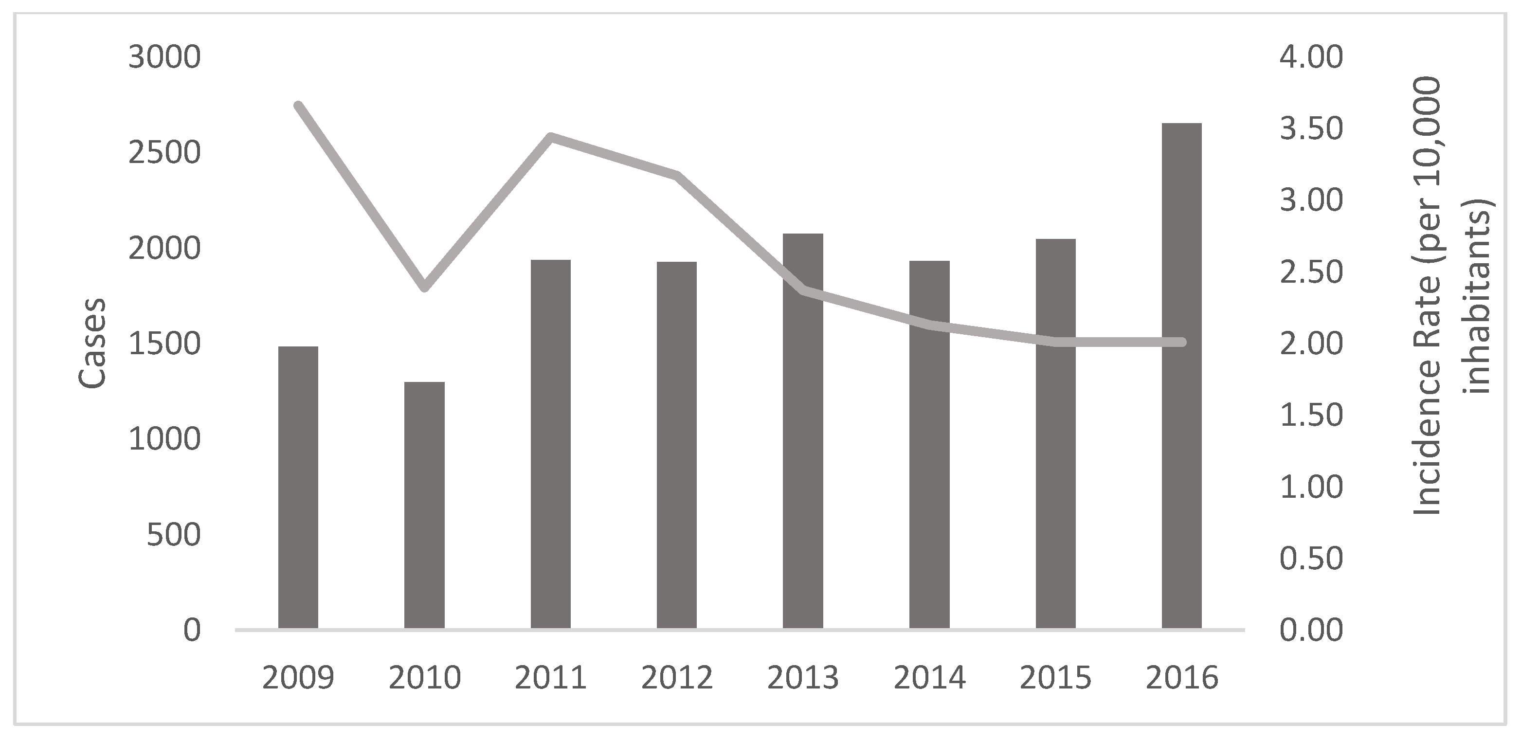 Between 2009 and 2016, 15,345 cases of leishmaniasis were confirmed in 112 municipalities across 14 (77.7%) of the 18 Honduran departments. The department with the highest number of cases was Olancho, with 4064 cases (26.5%), with an incidence rate of 75.2, whilst Copan was the department with the lowest number of cases (7 cases, 0.04%, incidence rate 0.7, as was Lempira (Table 1). UCL was the most prevalent form of the disease in the country, with 9167 cases (59.73%), followed by NUCL with 6055 cases (39.45%), ML with 92 cases (0.59%), and VL with 31 cases (0.20%) (Figure 2). The distribution of incidence remained stable from 2011 to 2015, followed by an increase in 2016, with 2652 cases (an incidence rate of 3.86 per 10,000 inhabitants) (Figure 3).