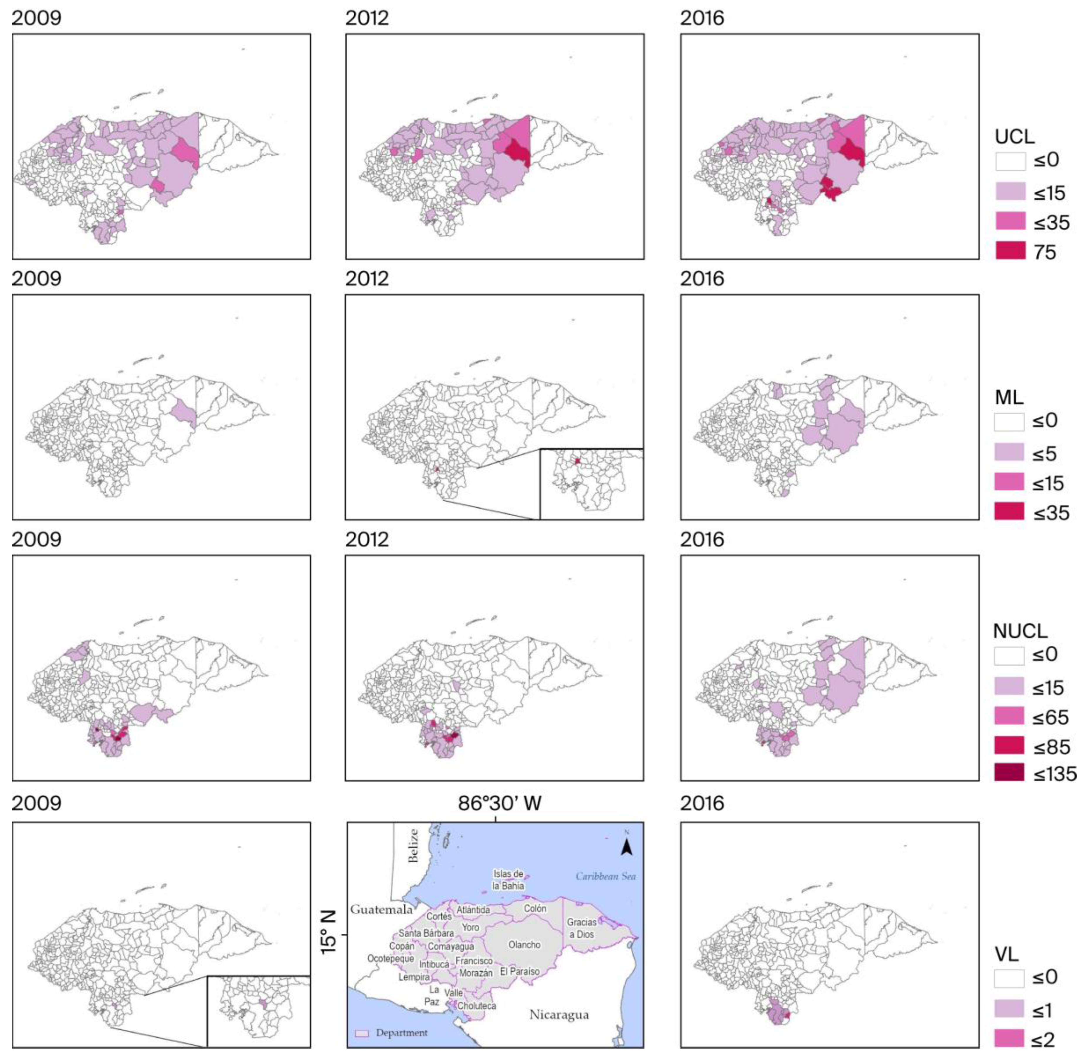 In the three years analyzed (Figure 4), UCL presented an incidence of 35 or greater in the departments of Olancho, Colón, El Paraíso, and Francisco Morazán. ML was only recorded in 2012, showing a rate of ≥35 in one of its municipalities, Choluteca. The NUCL had a rate of ≥65 in the Choluteca department, affecting up to three municipalities (2009 and 2012), and in one municipality of Valle in 2016, located in the southern part of the country. VL exhibited a similarly low incidence rate across all three years, also being concentrated in the southern region.