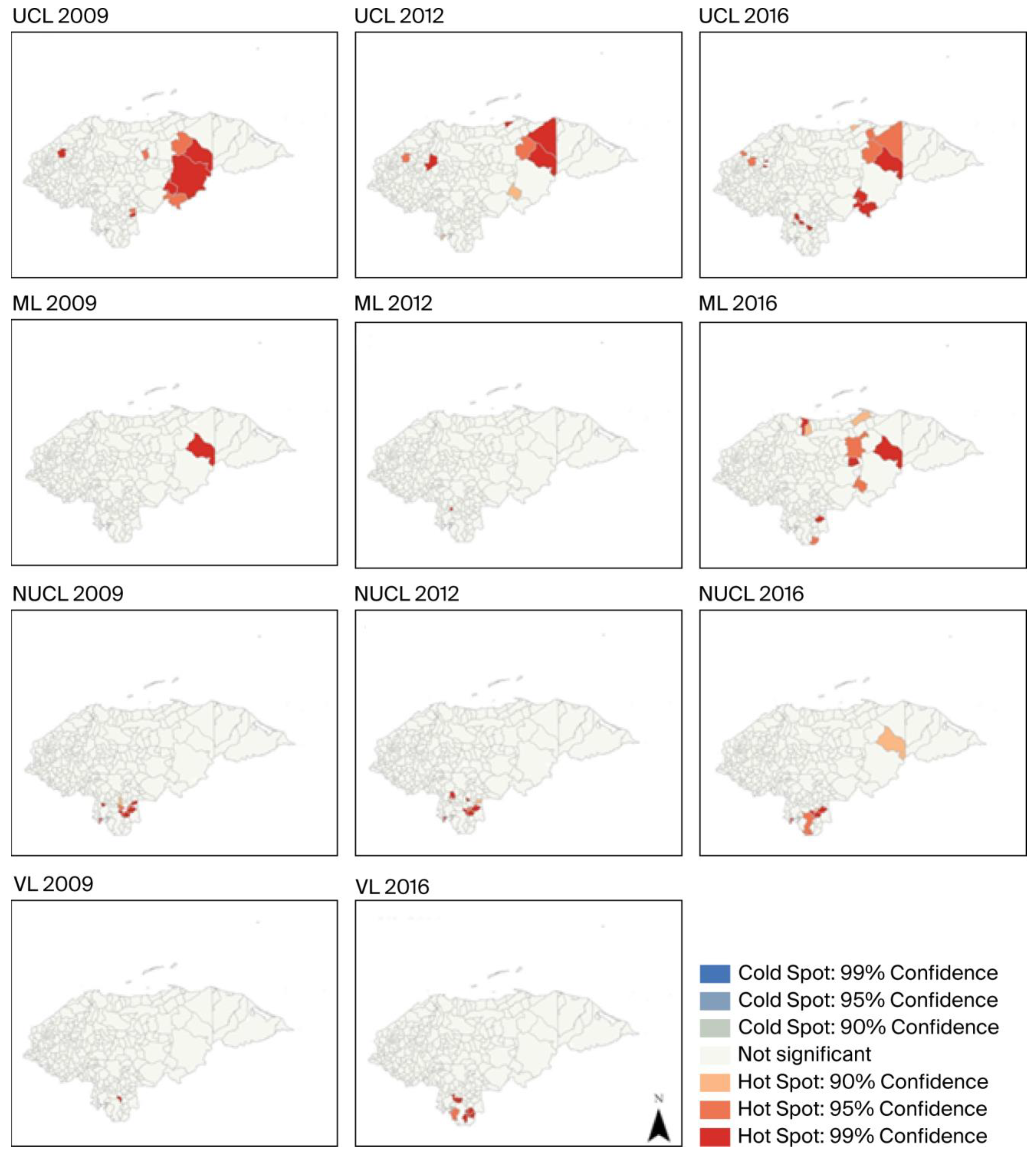 In 2009, the departments of Choluteca and El Paraíso exhibited remarkably high incidence rates of NUCL. The highest values were recorded in Choluteca’s municipalities of Apacilagua, Orocuina, and Morolica, along with San Francisco de Coray in Valle. The peak in 2012 shifted to Morolica, Amapala, and Reitoca from the Francisco Morazán department. By 2016, the incidence rate had significantly decreased compared to previous years, while Morolica and Orocuina also showed a decline; Amapala maintained a rate similar to its 2012 values.