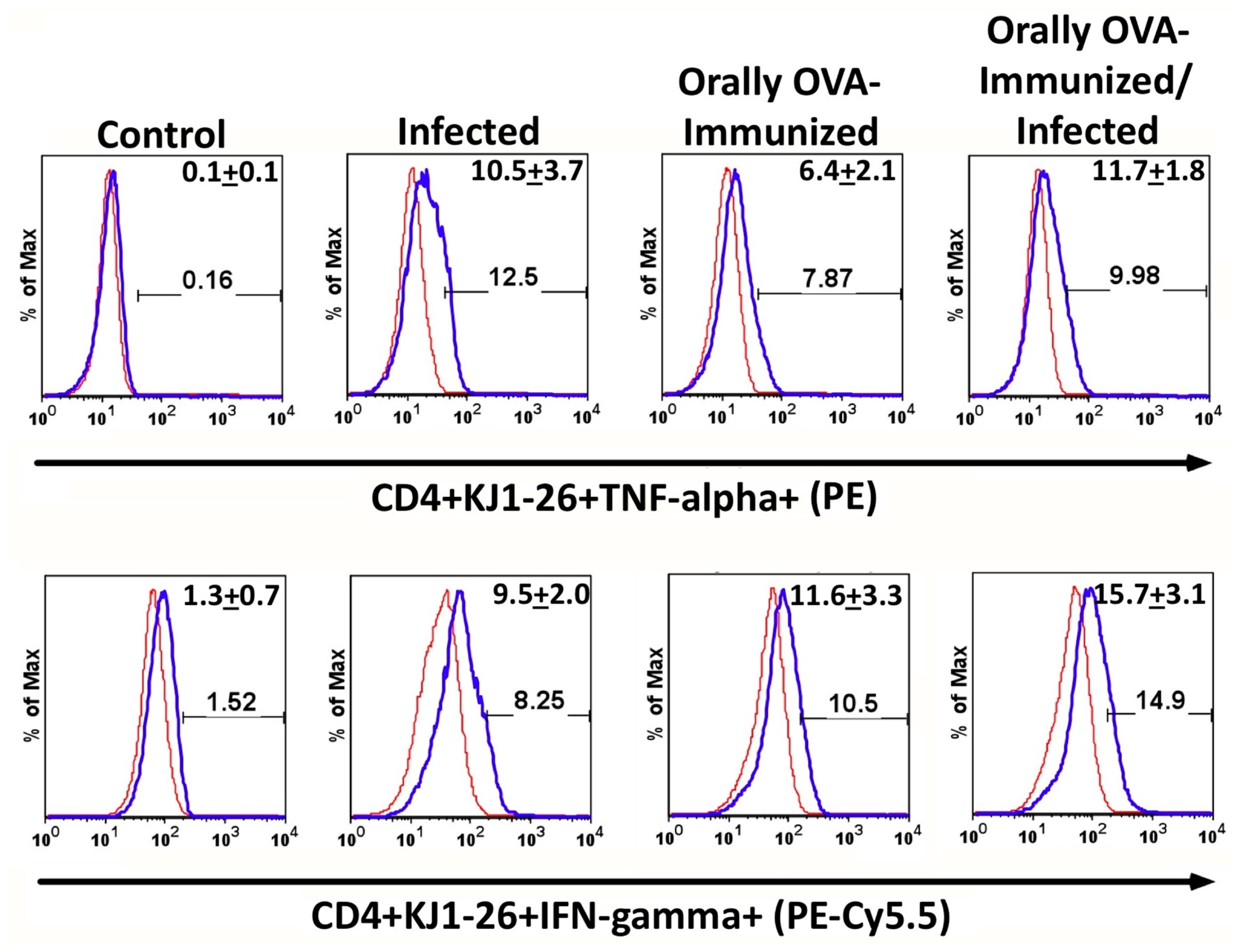 3.3. T. cruzi Infection Increases the Frequencies of Splenic TNF-α+ and IFN-γ+ DO11.10 Transgenic T Cells