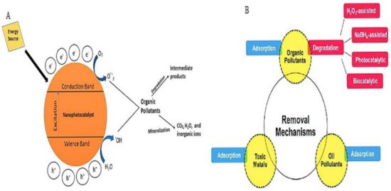 Mechanism of nanophotocatalysis for the treatment of environmental organic pollutants (A) and different pollutant removal techniques used by nano/micromotors (B). (Reproduced with permission of [44]. Copyright John Wiley and Sons, 2015).