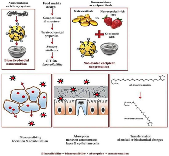 Schematic diagram showing the delivery of bioactive components in food. The overall oral bioavailability of bioactives is preserved by three major factors: bioaccessibility, absorption, and transformation. GIT: gastro-intestinal tract. (Reproduced with permission of [63]. Copyright Elsevier Taiwan LLC., 2016).