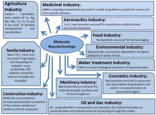 In oil and gas industry, nanomaterials are utilized to develop geothermal resources by enhancing thermal conductivity, improving down hole-separation, and aiding in the development of noncorrosive materials. This could be used for geothermal-energy production. Nanomaterials could be used to improve the prospects of developing unconventional and stranded gas resources. Nano-tubes have numerous applications in the oil industry. Nanoparticles could help improve oil and gas production by making it simpler to separate oil and gas in the reservoir—for example, through improved understanding of processes at the molecular level. Nanomaterials have been applied to improve oil recovery in the form of tailoring surfactants which can be added to the reservoir in a more controlled way than with existing substances, thereby releasing more oil [99]. In oil reservoir engineering the application of nanoparticles involves new types of smart fluids for improved oil recovery, and drilling [100]. Nanoparticles have special properties like adsorption, wettability, alteration and surface area play an important role in upstream oil and gas industry to increase the production. Nanoparticles are also utilized in drilling and completion in oil and gas industry, for example, clay stabilization, enhanced viscosity of drilling fluids, and fluid loss control, sloughing (wall collapse) control, stability of well bore, torque and drag friction, hydraulic fracturing and cementing etc. [101]. Furthermore, in gas industry air-suspended Ni-Fe nanoparticles injected in the hydrate formation to penetrate deep into hydrate reservoir by passing through the cavities. These nanoparticles also cause a temperature rise up to 42 °C leading to disturbance in thermodynamic equilibrium and can cause the water cage to decompose and release methane [74]. Finally, nanoparticles can address the issues related with accessing stranded natural gas resources by creating nanocatalysts and nanoscale membranes for gas-to-liquids production and making nanostructured materials for compressed natural gas (CNG) transport or significant distance power transmission [59]. CNTs are robust and proven as promising building blocks for oil/water separating membranes. Therefore, CNT-based membranes are used extensively in oil/water separation industry [102]. Nanomaterials are widely used in numerous industries to invent, and enhance the quality of products emerging rapidly into the markets. Useful applications of the nanoparticles in different industrial sectors all over the world is displayed in Figure 7.