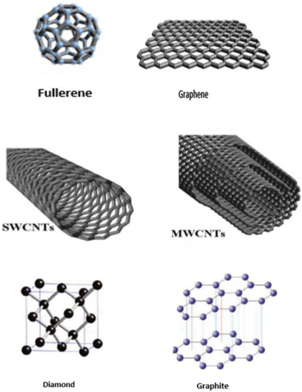 Representation of various allotropes of carbon: fullerene, graphene. Reprinted from Ref. [39]. Carbon nanotube (SWCNTs and MWCNTs), diamond, and graphite. Reprinted with permission from Ref. [45]. Copyright 2016 Taylor & Francis.